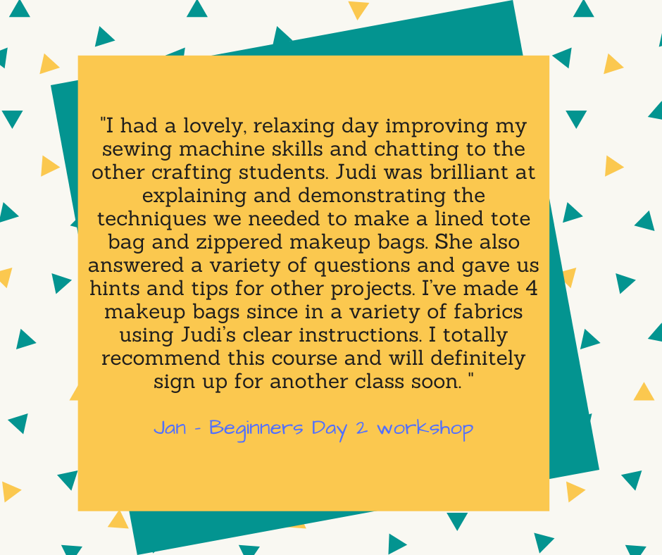 ""Simply all it should be. Lovely location, easy access from motorway, small group, very clear instruction from Judi at a pace which suited all, one stage at a time. Judi had time to assist everyone when they needed it. She is a very good tutor. We finished 2 zip bags on the day, most other workshops I've gone to need the work to be finished as home. I will definitely keep an eye out for more workshops"'